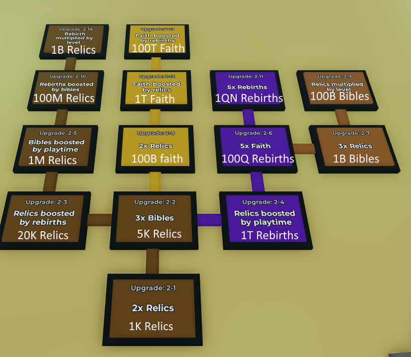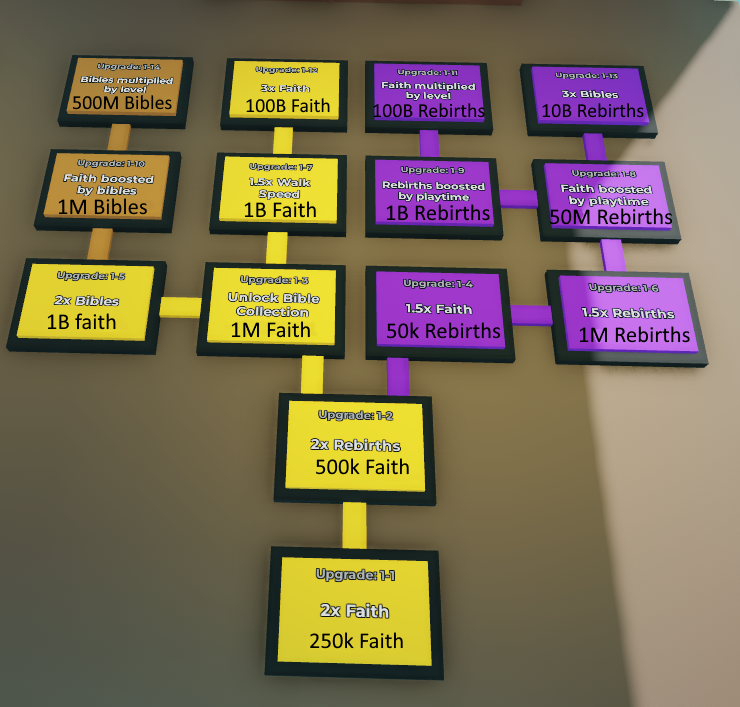 There are a few upgrades here that use Bibles, Faith, and Rebirths.