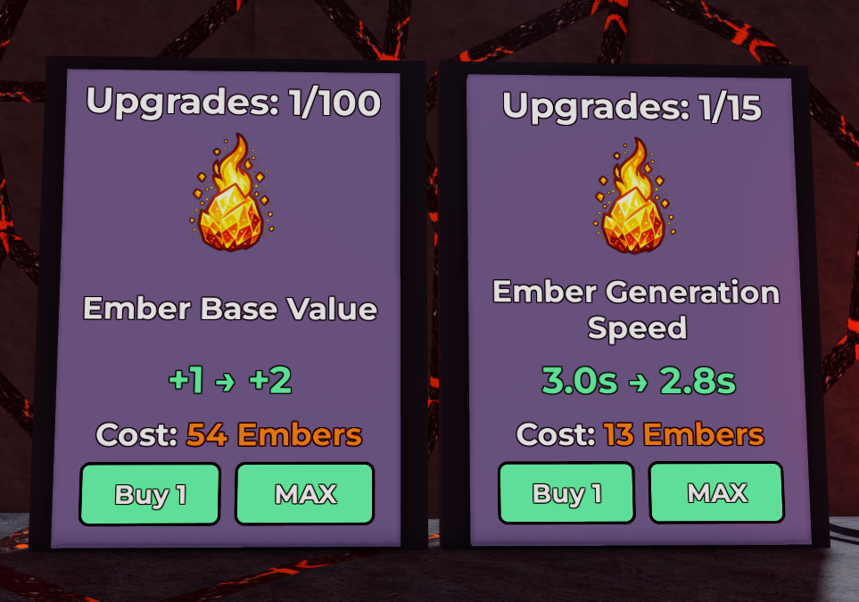 The way we do this is with Embers. This currency generates automatically while you're in the underground. You can upgrade both the speed and amount of embers you get using the boards on your right.