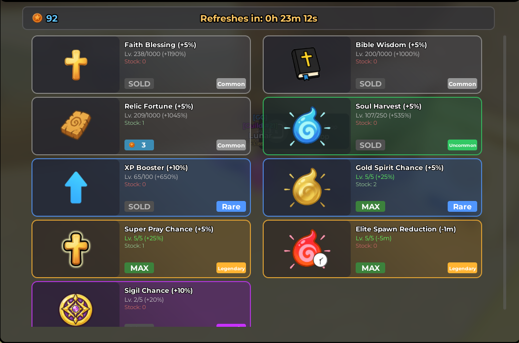 Each upgrade has a limit. Every 4 hours, the shop refreshes with random items. You share the same store with everyone in the game, but other players cannot buy your stock.