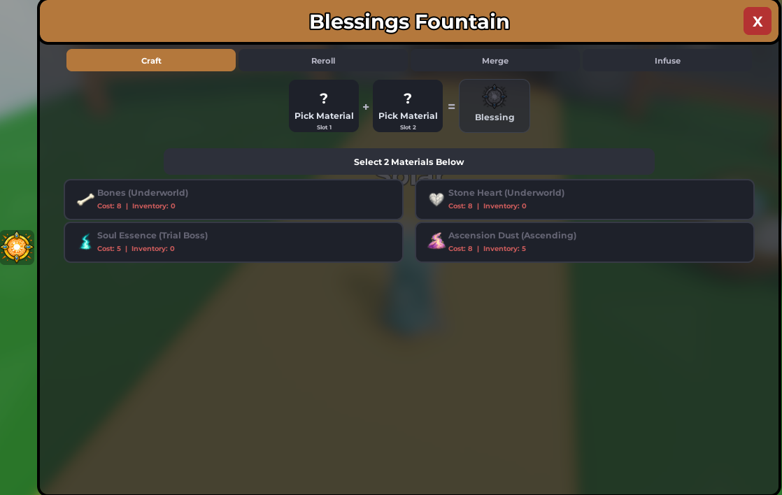 Crafting is fairly simple. You pick two materials to produce a blessing in one of the following rarities: Common, Uncommon, Rare, Legendary, or Mythic.